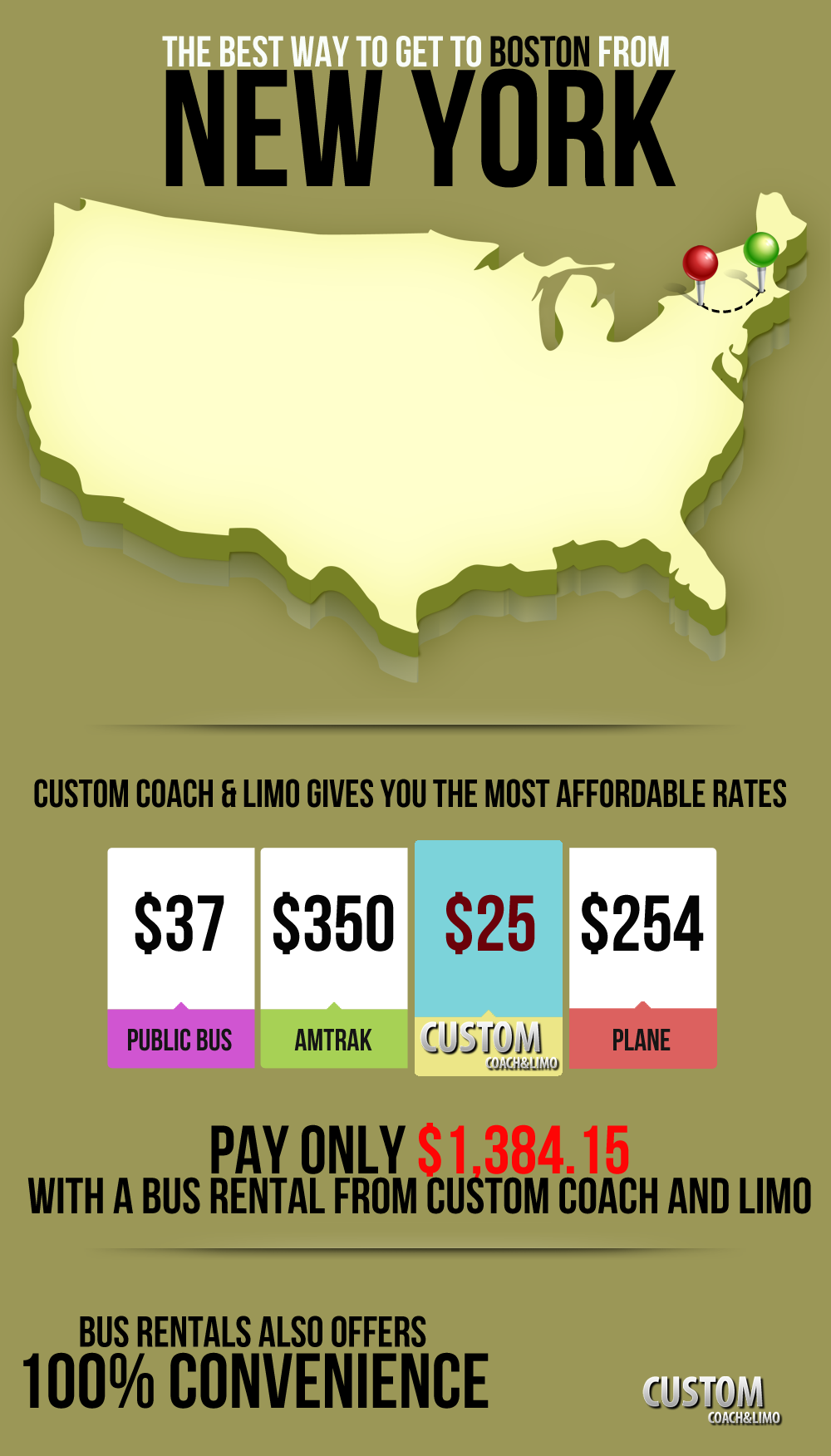Taking all the pros and cons together, traveling by bus rental in NYC is the most cost-efficient and the most convenient. A 55-passenger bus rental in NYC traveling to Boston can cost around $1300 and you can just divide the cost among yourselves. It may not be as cheap as taking the Mega Bus, but it is more convenient, considering that you do not have to share the space with other passengers. A bus rental can also pick you up at a place of your choice in NYC and can drop you right at your Boston hotel’s doorstep. No more rushing to and from stations and airports! This alone beats taking the train and taking the plane.